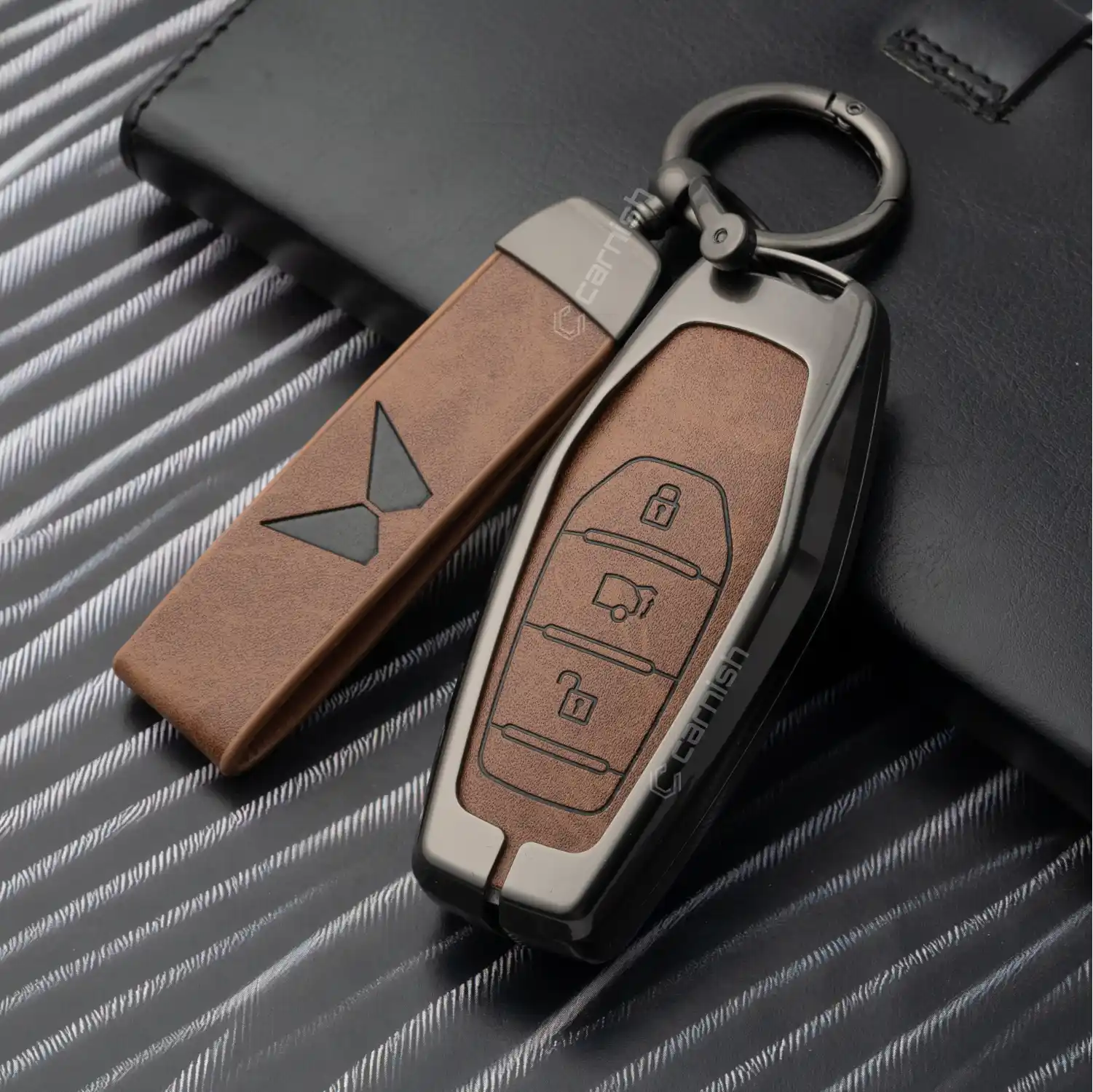A Metal Leather Car Key Cover is a premium protective case that combines a durable metal frame with genuine leather material. It protects your car key from scratches, dust, and daily wear while adding a luxurious look to your key fob.